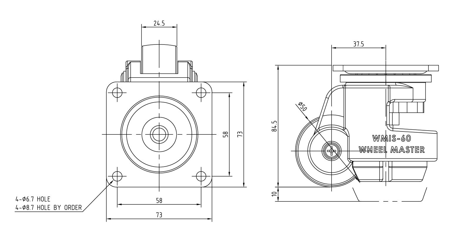600Kg | Ø50 | 24,5 | 82,5 | 10 | 37,5 | 73×73 | 58×58 | Ø 6,7 / Ø 8,7 |