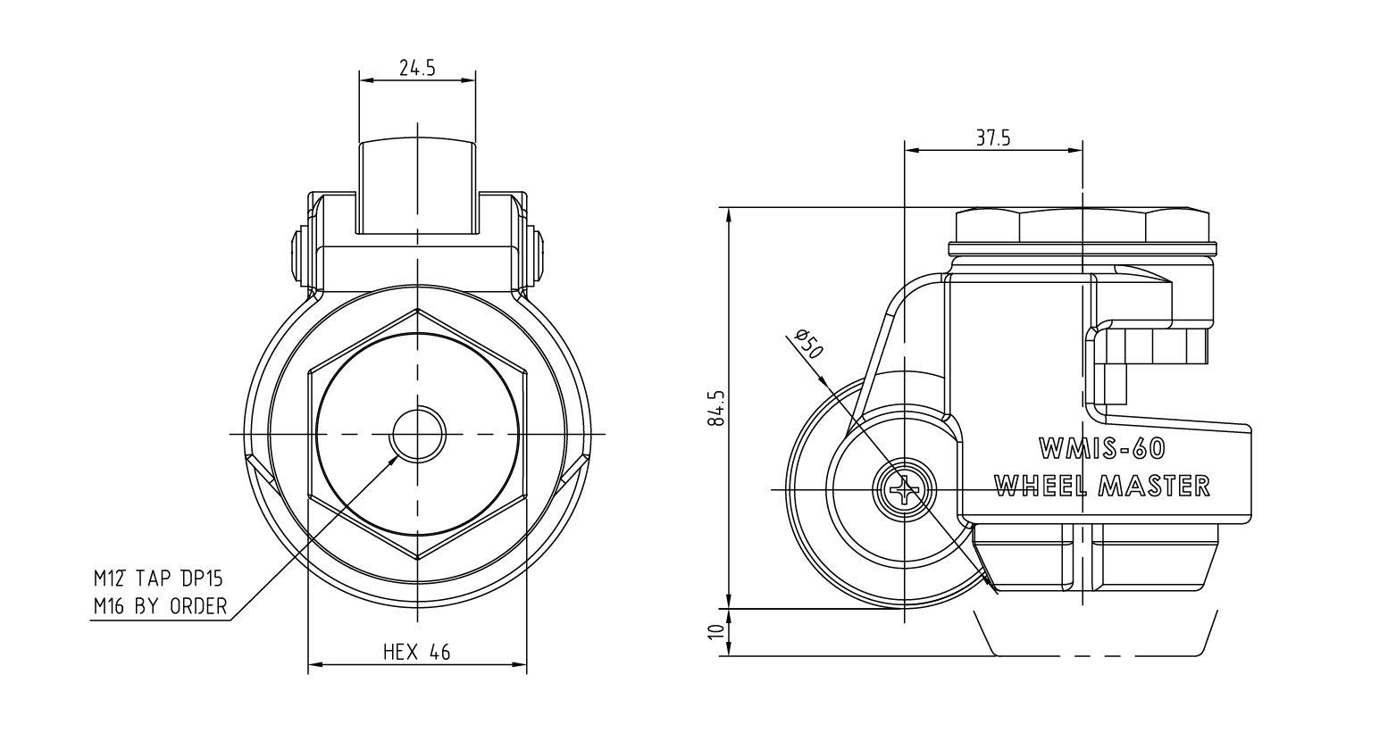 | 300Kg | 600Kg | Ø50 | 24.5 | 84.5 | 10 | 37.5 | M12 / M16 | 15 | 46 |