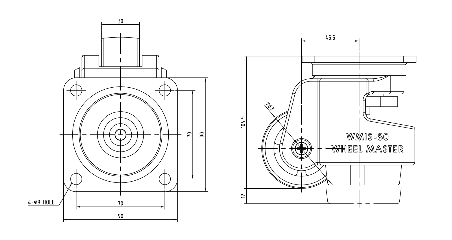 | 600Kg | 1,200Kg | Ø63 | 30 | 104.5 | 12 | 45.5 | 90×90 | 70×70 | Ø9 |